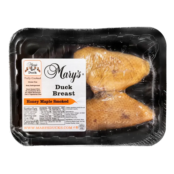 Experience gourmet flavor at home with Mary’s Honey Maple Smoked Duck Breast. Crafted from premium, humanely raised ducks, this fully cooked delicacy is smoked to perfection and finished with a touch of sweet honey and maple for a rich, savory-sweet balance.